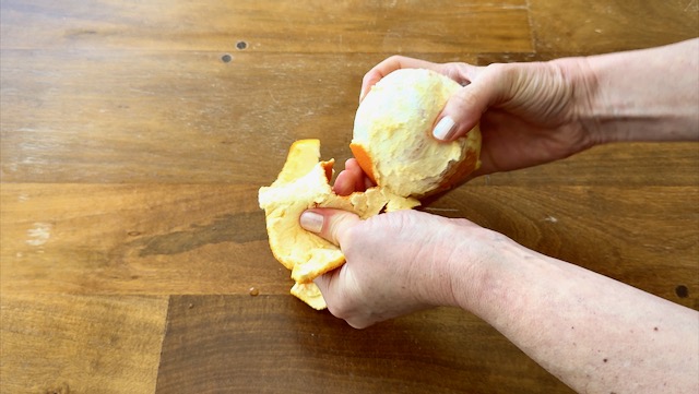 Peel the orange, leaving as much of the white pith on the fruit as you can, as the white part includes plenty of fiber and other beneficial nutrients that we want in the smoothie, too.