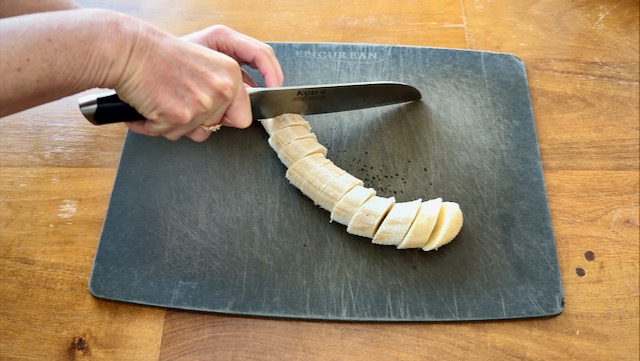 Slice a frozen banana into pieces. I usually peel and freeze my bananas whole, then slice them once they're frozen. That way, they're easy to pull apart from one another (unlike frozen banana chunks which can be difficult to separate because they stick together and are hard to grip), and a knife will still slice through a whole banana quite easily once it's frozen.
