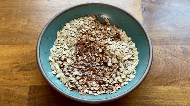 In a mixing bowl, combine ¾ cup rolled oats, 1½ Tbsp almond flour (or substitute almond powder for a lower-fat / lower-calorie option), 1½ Tbsp oat flour, 1 Tbsp ground flax seed, 1 tsp cinnamon, and ¼ tsp cloves. If you're using chopped walnuts and pecans, you can add those now, as well.