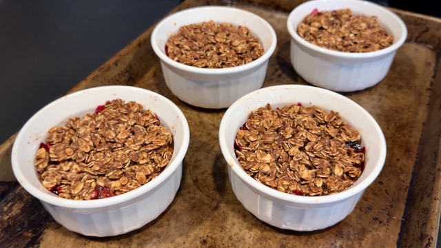 I use 7-oz baking ramekins from a larger set of CorningWare ceramic baking dishes I received as a gift a long time ago. It seems the standard size baking ramekin ranges between 6 oz and 8 oz in size, and these are easy to find on Amazon. If you don't have these, you can use oven-safe ceramic mugs instead (preferably all the same size so the Plum Crumble will bake evenly) or combine the entire recipe in a single 1.5-quart ceramic baking dish, in which case you'll likely need to bake it for a bit longer (closer to 45 minutes). For reference, check out how I do this with my Apple Crisp recipe.